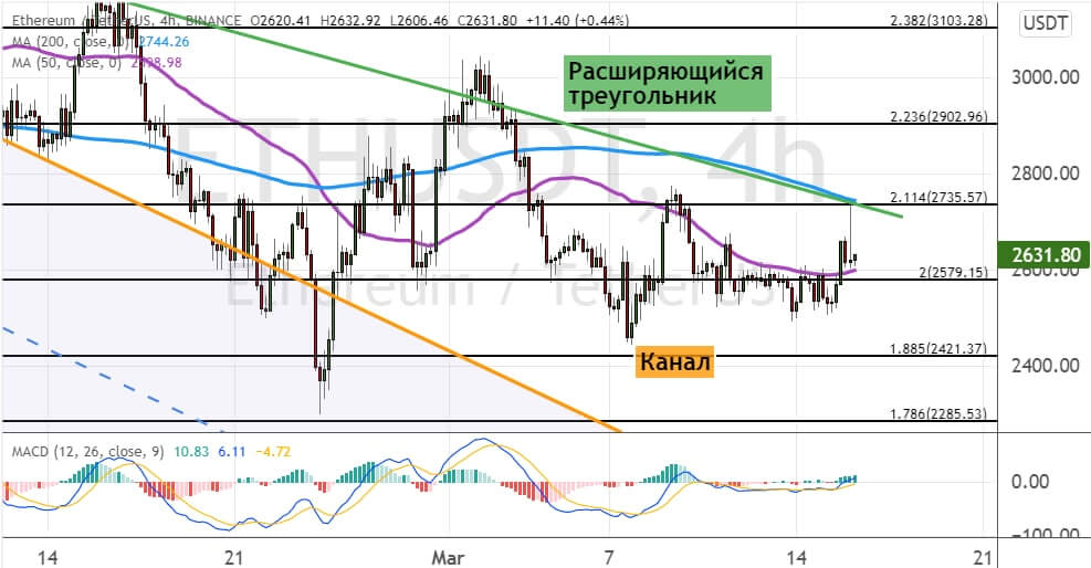 Торги эфиром проходят между поддержкой $2 580, где расположена линия 50-периодной SMA, и сопротивлением $2 740, в районе которого проходит граница модели теханализа «Расширяющийся треугольник» (на графике ниже ее границы отмечены линиями зеленого цвета) и линия 200-периодной SMA.