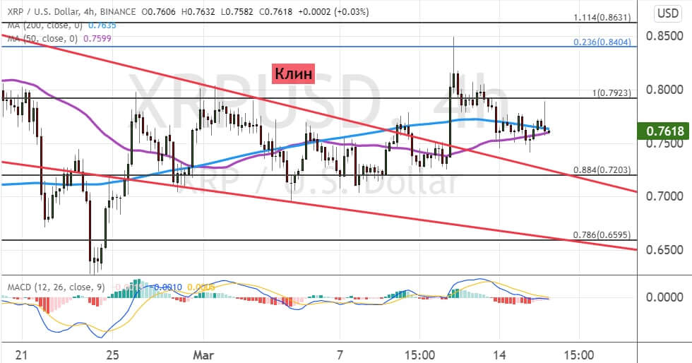 Котировки XRP торгуются между поддержкой $0.75, где сошлись линия 50-периодной и 200-периодной SMA, и сопротивлением $0.78–$0.8.
