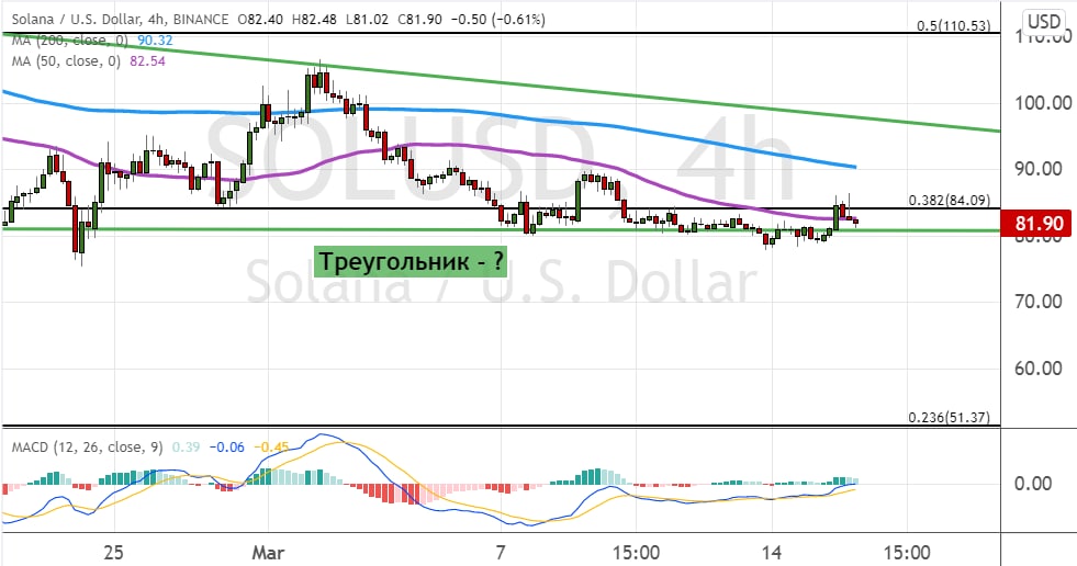 Котировки SOL торгуются выше поддержки $80, где также проходит нижняя граница модели теханализа «Треугольник» (обозначена на графике ниже линиями зеленого цвета) и линии 50-периодноц SMA. Сопротивлением для текущих котировок выступает уровень $84.
