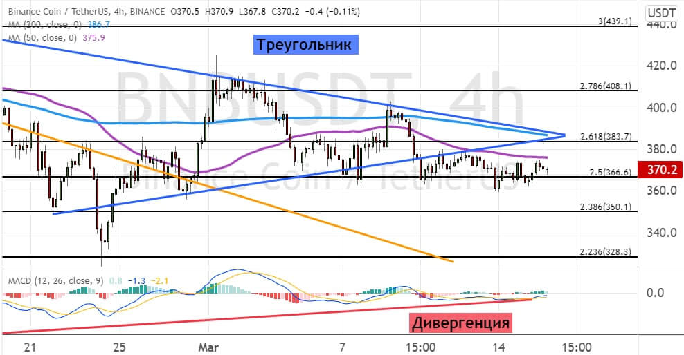 Котировки BNB продолжают консолидироваться между поддержкой $365 и сопротивлением $380, где также проходят граница модели теханализа «Треугольник» (обозначена на графике ниже синем цветов) и линии 50-периодной и 200-периодной SMA.