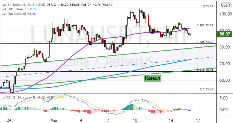 Криптовалюта LUNA от проекта Terra консолидируется между поддержкой на уровне $82 и  сопротивлением $93.