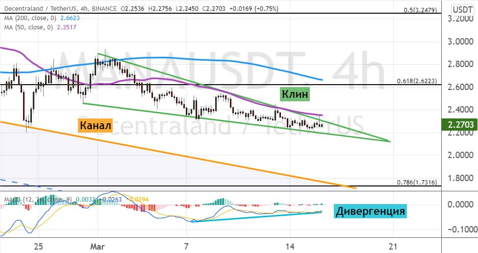 Закрытие нескольких дневных свечей выше $2.6 станет сигналом о развитии новой волны восходящего движения, которое направит котировки MANA к уровням $3 и $3.3. Между ними также проходит верхняя граница модели теханализа «Восходящий канал». В пользу этого сценария развития торгов указывает дивергенция между ценой на графике и осцилляторе MACD.