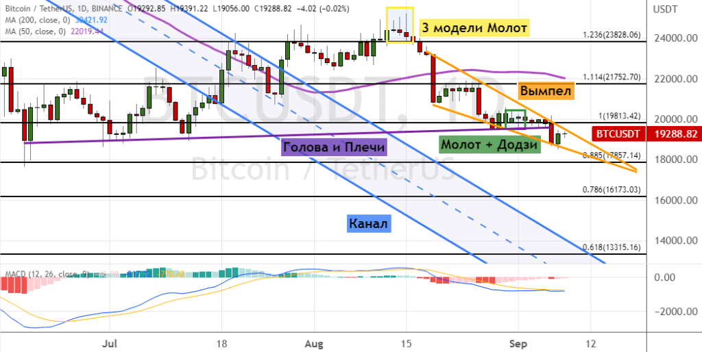 Сохранение тренда в краткосрочной перспективе приведет к снижению биткоина до уровня $17 000. Падение ниже этого уровня станет сигналом о восстановлении медвежьего тренда. Более глубокая коррекция обвалит стоимость актива до уровней $16 200 и $15 000. В пользу этой динамики указывают три модели теханализа «Молот» (обозначены желтыми линиями), а также ранее сформировавшиеся модели «Молот» и «Додзи» (обозначены линиями зеленого цвета). Также на возможную реализацию этого прогноза указывает сигнал в виде вероятного преодоления нижней границы «Вымпел» и вероятное формирование модели «Голова и плечи» (линия шеи обозначена фиолетовым цветом).