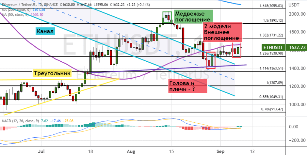 Но если быкам удастся восстановить восходящую динамику и закрепиться выше текущего уровня сопротивления, то первыми целями для быков выступят уровни $1 730, $1 800 и $1 900. Дальше в рамках краткосрочного тренда на повышение эфир направится к границам кластера $2 000–$2 055, выше которых расположилась линия 200-дневной SMA. В пользу развития этого сценария торгов указывают сигналы в виде пробития верхних границ «Канала» (обозначен бирюзовым цветом) и «Треугольника», а также двух моделей «Внешнее поглощение» (отмечены темно-розовым цветом).