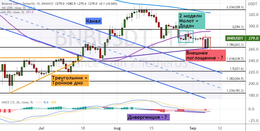 Закрытие дневных свечей выше уровня $295, где также проходит линия 50-дневной SMA, и уровня $300 приведет к восстановлению бычьей динамики. Она направит котировки альткоина к первым целям в виде границ кластера $320–$330, между которыми также проходит линия 200-дневной SMA. Сохранение восходящего тренда позволит котировкам BNB продолжить рост до уровней $340, $350 и $366. В пользу реализации этого прогноза указывают сигналы в виде пробития верхней границы «Нисходящего канала» (обозначена синим цветом) и границ модели «Треугольник», а также вероятное формирование двух моделей теханализа «Молот», модели «Додзи» (обозначены темно-бирюзовым цветом) и модели «Внешнее поглощение» (отмечены темно-розовым цветом). В пользу этой динамики также указывает бычья дивергенция между ценой на графике и осцилляторе MACD.