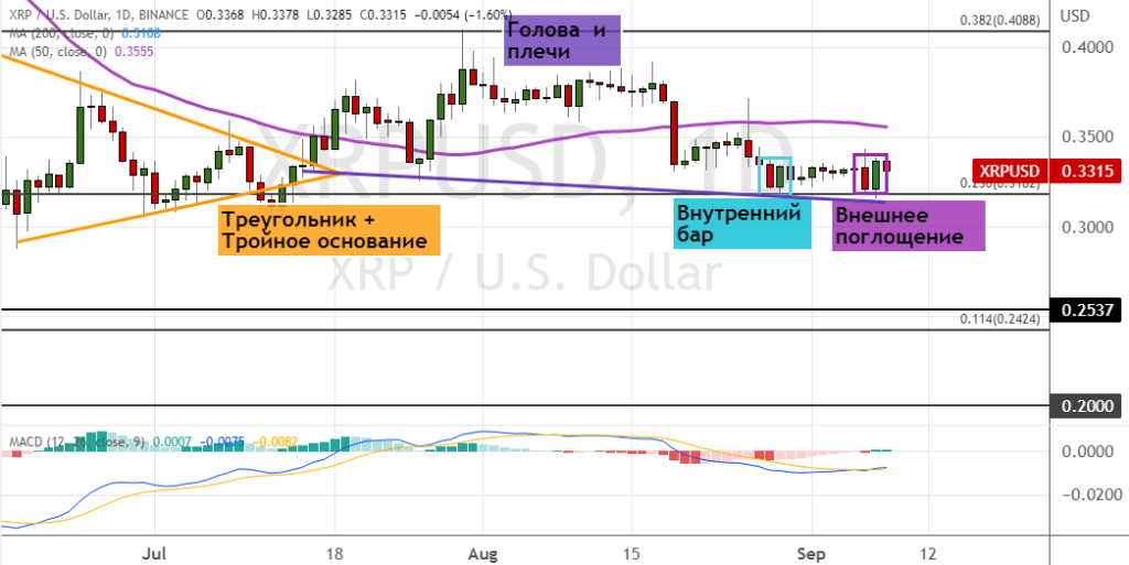 Если быкам удастся закрепиться выше уровня сопротивления и границ кластера $0.4–$0.41, то в рамках бычьей динамики XRP устремится к целям $0.45, $0.48 и $0.55. В пользу развития этого сценария торгов указывают три сигнала теханализа: преодоление верхней границы «Треугольника», «Тройное основание», модель «Внутренний бар», а также вероятное формирование «Внешнего поглощения».