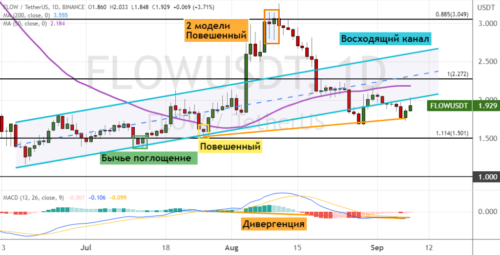 Но в случае падения FLOW ниже границ консолидации $1.7–$2, в районе которых также проходит нижняя грань модели «Восходящий канал», медвежья динамика направит альткоин к линии поддержки $1.6. Более глубокая коррекция приведет к снижению стоимости FLOW до границ консолидации $1.2–$1.5. В пользу развития краткосрочной нисходящей динамики указывают две модели теханализа «Повешенный» (обозначены оранжевым цветом), а также вероятное преодоление нижней границы «Восходящего канала».