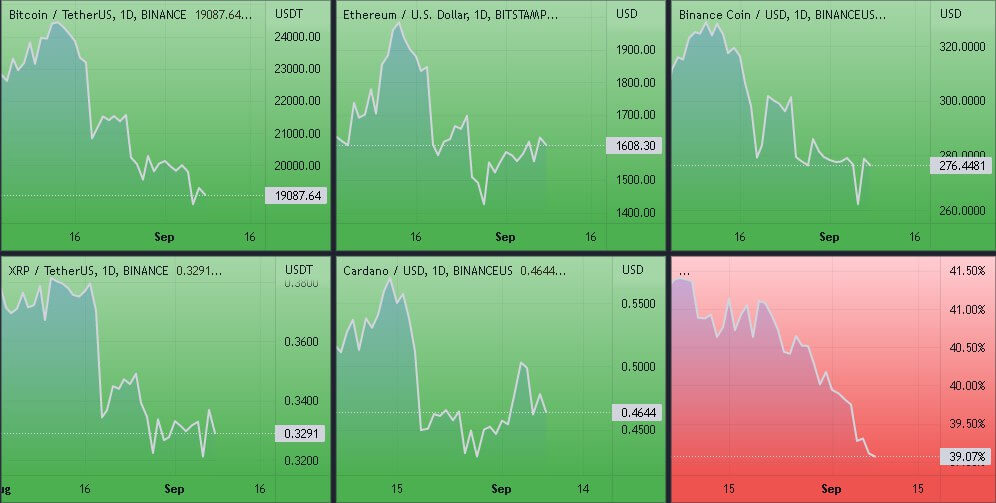 Динамика котировок BTC, ETH, BNB, ADA, XRP (дневной таймфрейм) и график доминации биткоина. Источник