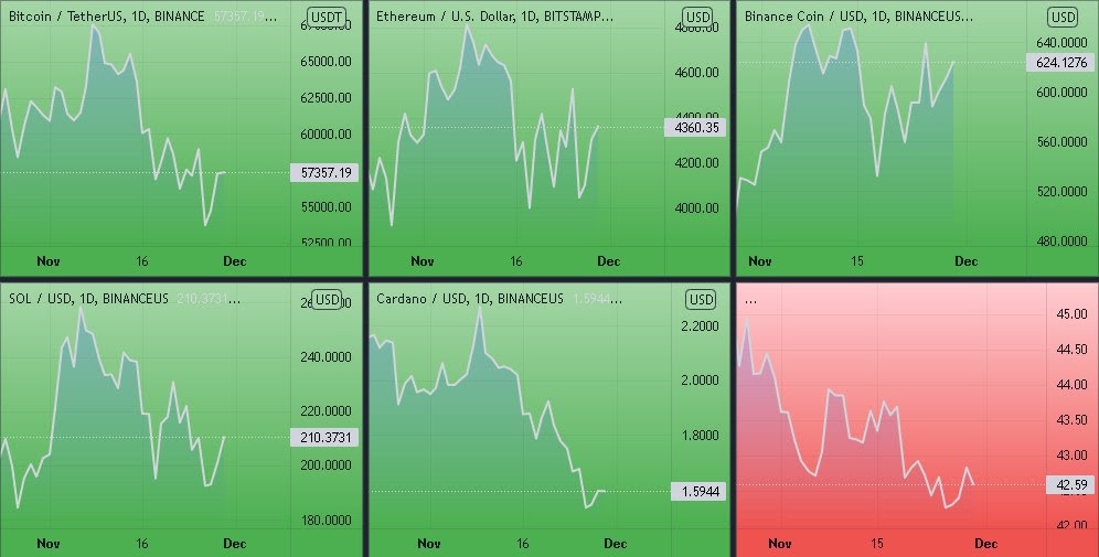 Динамика котировок BTC, ETH, ADA, BNB, XRP (дневной таймфрейм) и график доминации биткоина. Источник