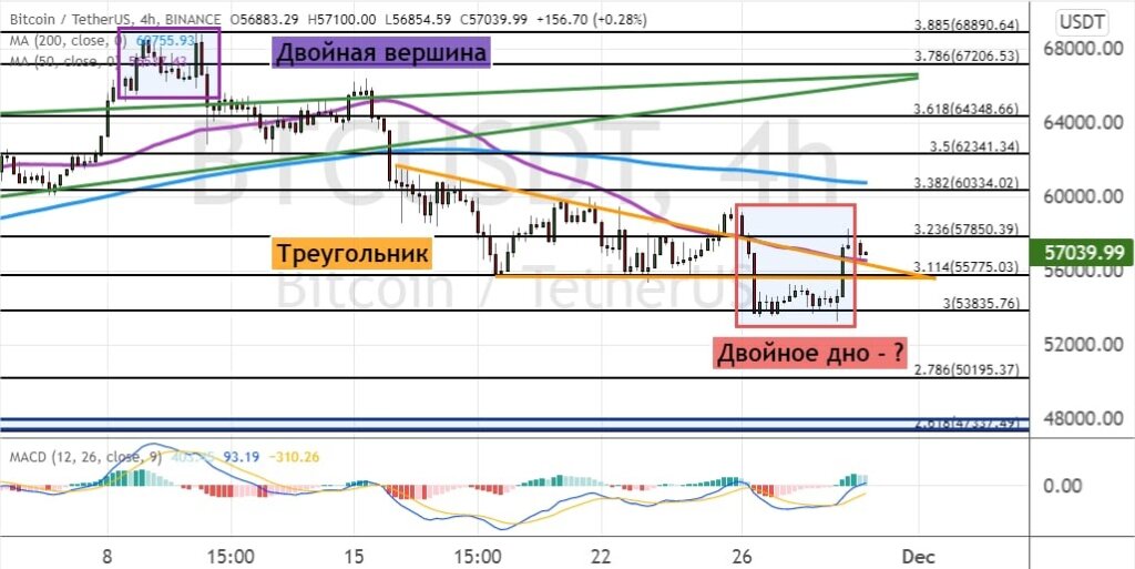 Котировки BTC приостановили снижение и сегодня протестировали уровень сопротивления $57 850, где также проходят границы модели теханализа «Нисходящий треугольник» (обозначена на графике ниже оранжевым цветом).