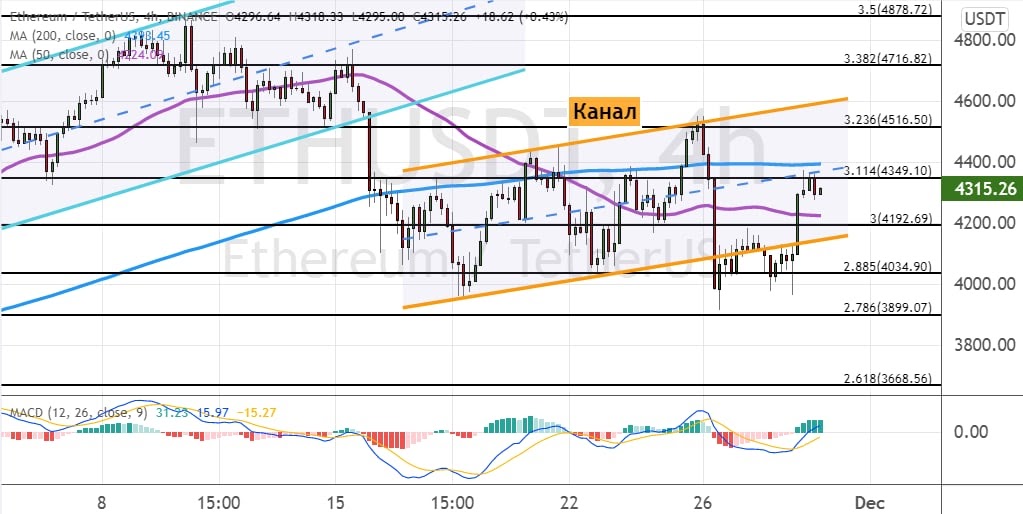 Эфир торгуется между важным сопротивлением $4 350, где расположена линия 200-периодной SMA, и поддержкой $4 200, где проходит 50-периодная SMA. Текущие торги ведутся внутри границ модели теханализа «Канал» (обозначена на графике ниже оранжевым цветом).