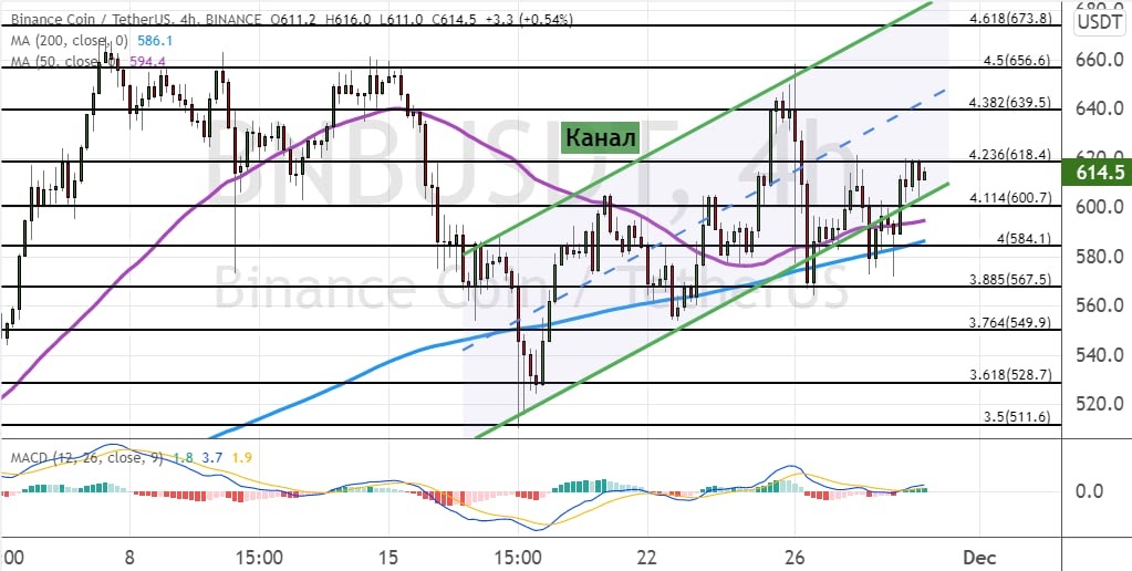 BNB развивает движение вдоль нижней границы модели теханализа «Канал» (обозначена на графике ниже зеленым цветом). Текущими сопротивлениями для котировок альткоина выступают уровни $620 и $640, а поддержка расположена на отметке $600.