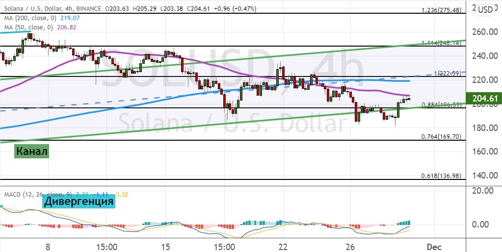 Сегодня SOL торгуется в районе уровня $200, чуть выше которого проходит линия 50-периодной SMA и нижняя граница модели теханализа «Канал» (обозначена на графике ниже зеленым цветом).