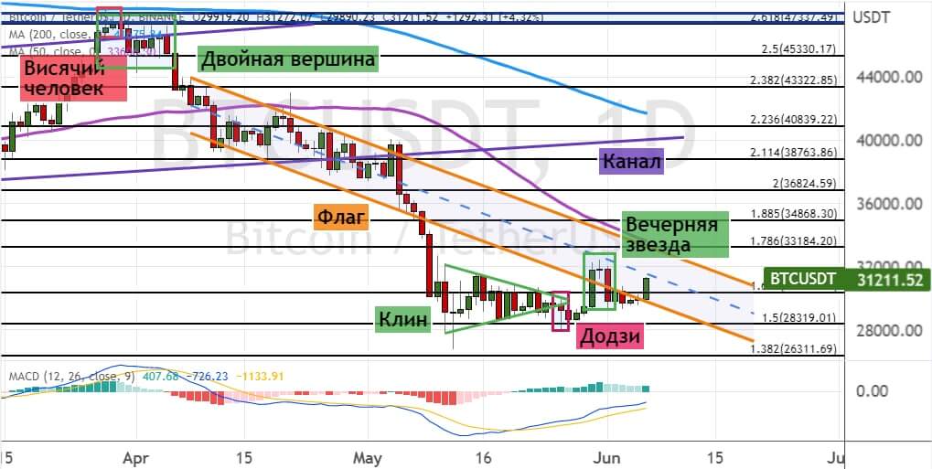 Но не стоит забывать, что и у медведей все еще есть силы, чтобы развернуть торги в свою пользу. Восстановление медвежьей динамики будет наблюдаться в том случае, если дневные свечи закроются ниже поддержки $28 300. Далее коррекция направит котировки BTC к уровням $26 300, $23 800 и $20 000. В пользу реализации этого сценария торгов все еще указывают пять сигналов: модели теханализа «Двойная вершина» (обозначена линиями зеленого цвета) и «Висячий человек», а также пробитие нижних границ «Восходящего канала» (линии фиолетового цвета), «Флага» (линии оранжевого цвета) и свечной комбинации «Вечерняя звезда».