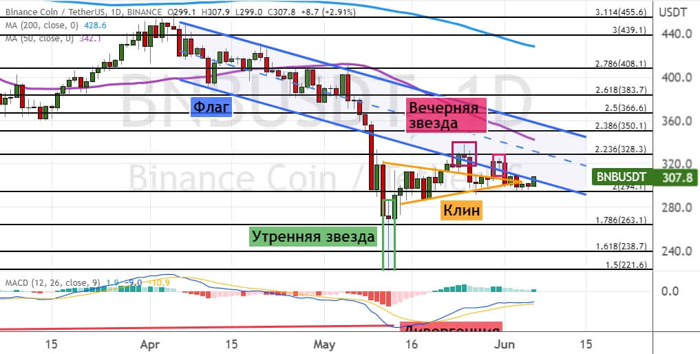 Котировки BNB поднялись выше уровня поддержки $300 и сейчас находятся в районе нижней границы модели «Флаг» (обозначена синим цветом). Если быки смогут подняться выше уровня $330, то дальше BNB направится к границам кластера уровней $350—366, где также расположена линия 50-дневной SMA. В пользу реализации этой идеи указывают три сигнала теханализа: прорыв верхней границы «Флага», свечная комбинация «Утренняя звезда», а также дивергенция между ценой на графике ETH и осцилляторе MACD.