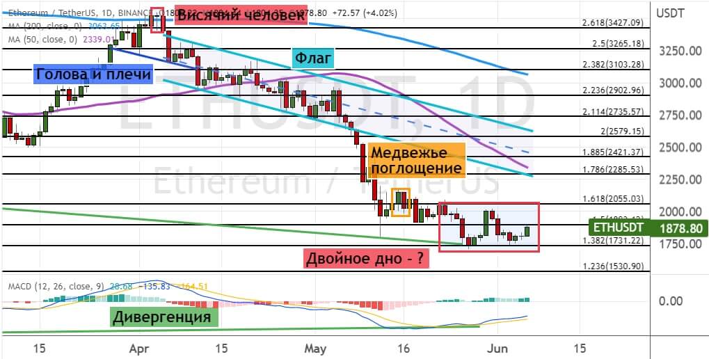 Однако если ETH пробьет поддержку на уровне $1 730, то есть вероятность снижения стоимости альткоина до уровней $1 530 и $1 360. В пользу этого варианта развития торгов указывают четыре сигнала теханализа: модели «Голова и плечи» (границы отмечены линиями синего цвета), «Медвежье поглощение» (обозначена оранжевым цветом) и «Висячий человек», а также прорыв нижней границы «Флага».
