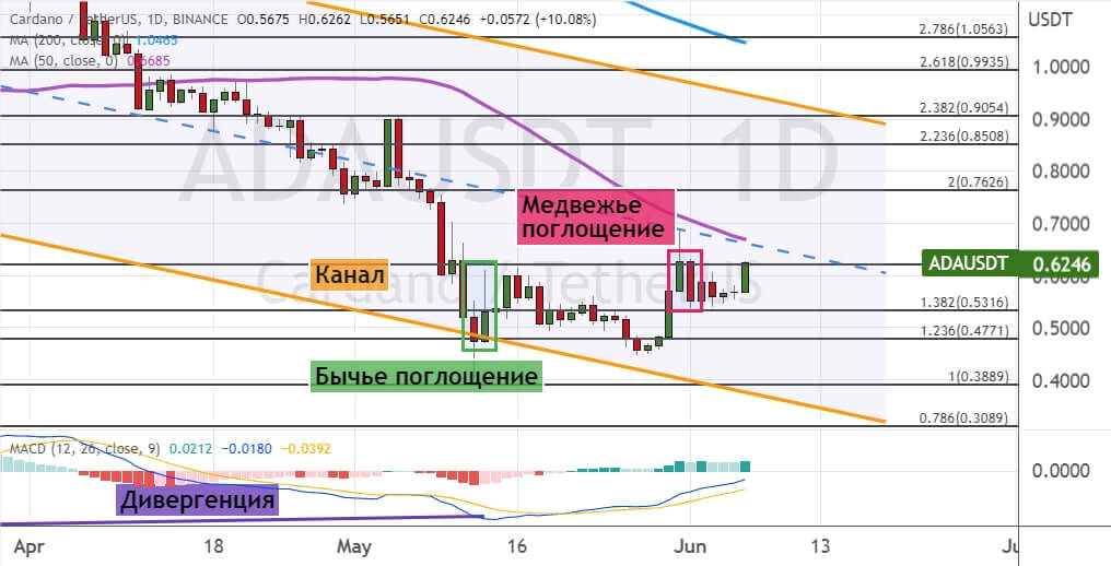 Однако модель теханализа «Медвежье поглощение» указывает на возможное развитие краткосрочного снижения котировок ADA к поддержкам $0.53 и $0.48. Более глубокая коррекция к $0.4 и $0.31, между которыми также расположена нижняя граница модели теханализа «Канал», пока представляется менее вероятным сценарием развития торгов.