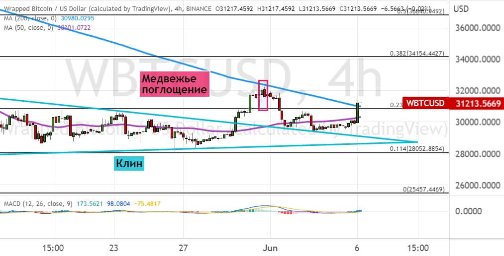 Котировки BTC поднялись выше важного уровня $31 000 и вернулись в рамки границ модели теханализа «Флаг» (обозначена линиями оранжевого цвета).