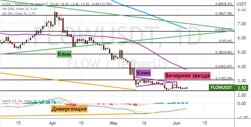 Однако в случае закрытия нескольких дневных свечей выше уровня сопротивления $3 стоит ожидать роста стоимости FLOW до первых целей $3.9, где проходит линия 50-дневной SMA, и $4.9. Сохранение импульса приведет к росту котировок альткоина до $5.7. В пользу этой идеи указывает сохранение дивергенции между ценой на графике и на осцилляторе MACD.
