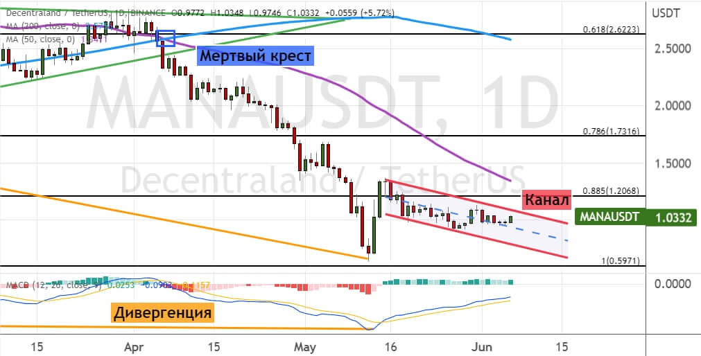 При этом восстановление тенденции на снижение приведет к обвалу котировок MANA до первой цели $0.6.
