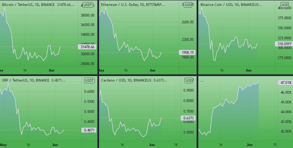 Динамика котировок BTC, ETH, BNB, ADA, XRP (дневной таймфрейм) и график доминации биткоина. Источник