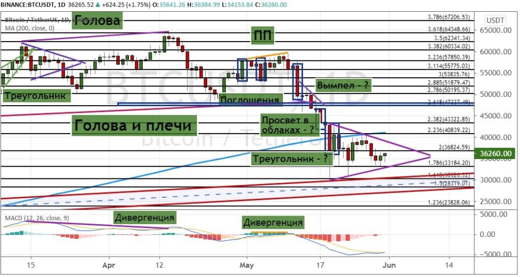Это может привести к формированию модели теханализа «Треугольник» (отмечена на графике ниже), пробитие нижней границы которой будет сигнализировать о новой волне снижения. В случае пробития поддержки $33 200 в краткосрочной перспективе котировки BTC устремятся к уровням $30 000 и $28 300. В пользу этого указывает также формирование сегодняшней дневной японской свечи в формации «Повешенный». Более глубокое снижение приведет к тому, что стоимость биткоина может опуститься до отметок $25 000, $23 800 и $20 000, рассчитанных на основе пропорции Фибоначчи.