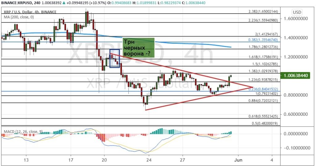 Котировки XRP сформировали схожую с биткоином модель теханализа «Треугольник» в конце нисходящего движения. На графике ниже можно наблюдать попытку роста котировок альткоина выше сопротивлений $0.94 и $1.03. Закрытие выше них позволит XRP  подняться к первым целям $1.10, $1.18 и $1.28, где проходит линия 200-дневной SMA. В среднесрочной перспективе уход выше нее приведет к достижению кластера $1.35 – $1.42, а дальнейший рост позволит достичь $1.55 и $1.65.