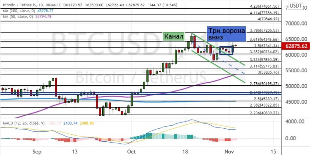 Во то же время на графике биткоина появилась свечная комбинация «Три вороны вниз» (обведена синими линиями на графике ниже), которая указывает на возможный рост до первых целей $63 300 и $64 350. Данная комбинация сформировалась после того, как котировки BTC пробили границы модели теханализа «Нисходящий канал» (обозначена ниже зеленым цветом на графике ниже). Сигналом о развитии среднесрочного восходящего тренда выступит рост котировок выше $70 800. Но сначала быкам необходимо будет взять уровень $67 200.