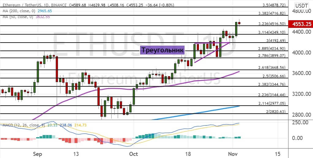 После закрытия выше границ модели теханализа «Треугольник» (показана на графике ниже фиолетовым цветом) котировки ETH устремились вверх. В результате эфиру удалось закрепиться выше сопротивлений $4 350 и $4 500. Сохранение восходящего импульса позволит говорить о формировании среднесрочного восходящего тренда, который позволит котировкам ETH подняться до уровней $4 720 и $4 880.