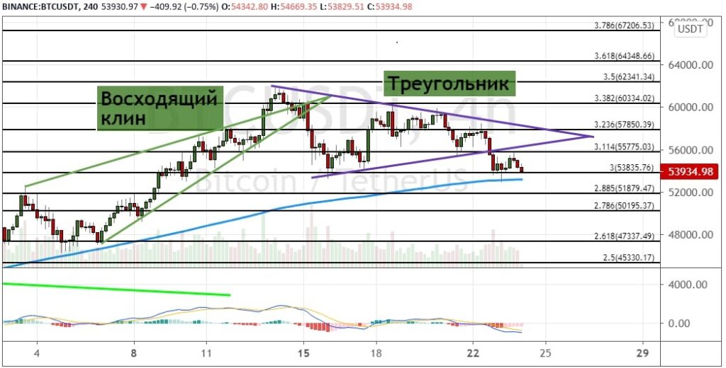 Во вторник биткоин начал реализовывать медвежий вариант развития торгов, что привело к выходу вниз за рамки модели теханализа «Треугольник». В результате котировки BTC прорвали нижнюю границу этой модели теханализа и опустились ниже линии сопротивления на $55 800 к $53 800.