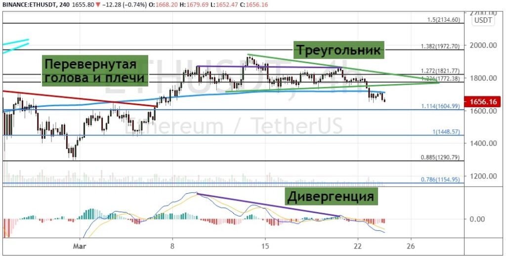 Эфир опустился за рамки области $1 772 – $1 820 и линии 200-дневной SMA, которая отмечена на графике ниже. В пользу реализации этого сценария указывал сигнал в виде дивергенции между ценой и осциллятором MACD. Если нисходящая тенденция сохранится, то в ближайшие дни ETH проверит на устойчивость поддержку на $1 600 (11.4% расширение по уровням пропорции Фибоначчи) и область $1 400 – $1 450.