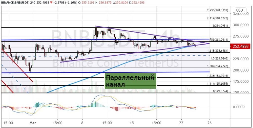 Если BNB опустится ниже линии 200-дневной SMA, то котировки альткоина снизятся к первой цели на $238. А сохранение нисходящего импульса направит котировки BNB к уровням $220 и $200, где проходит нижняя граница фигуры «Параллельный канал».