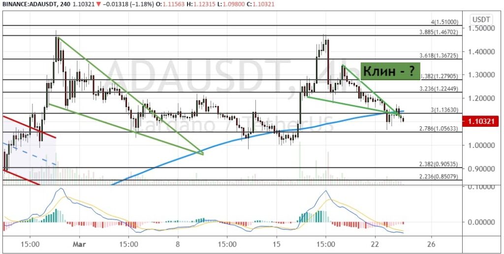 ADA пробил нижнюю границу модели теханализа «Клин» и опустился ниже $1.1360, где проходит линия 200-дневной SMA. Теперь этот уровень выступает сопротивлением. Но если альткоину удастся его пробить, это станет сигналом о развитии восходящего движения к первым целям на уровнях $1.2250 и $1.2790. При этом новая попытка движения вниз будет сдержана областью поддержки $1 – $1.05, а ее прорыв может привести к движению до уровней $0.9050 и $0.85.