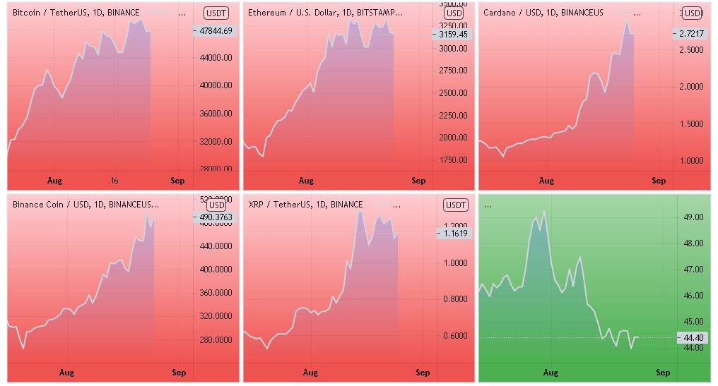 Динамика котировок BTC, ETH, ADA, BNB, XRP (дневной таймфрейм) и график доминации биткоина. Источник