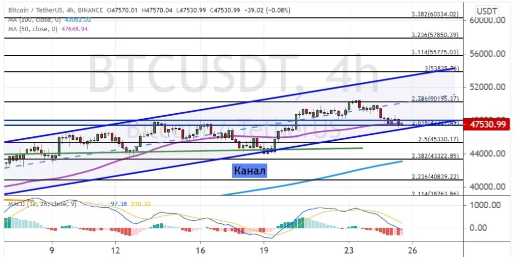 На графике биткоина ниже отмечаем, что котировки BTC пока не могут закрепиться выше психологически важного уровня сопротивления $50 000, что привело к развитию краткосрочной коррекции.
