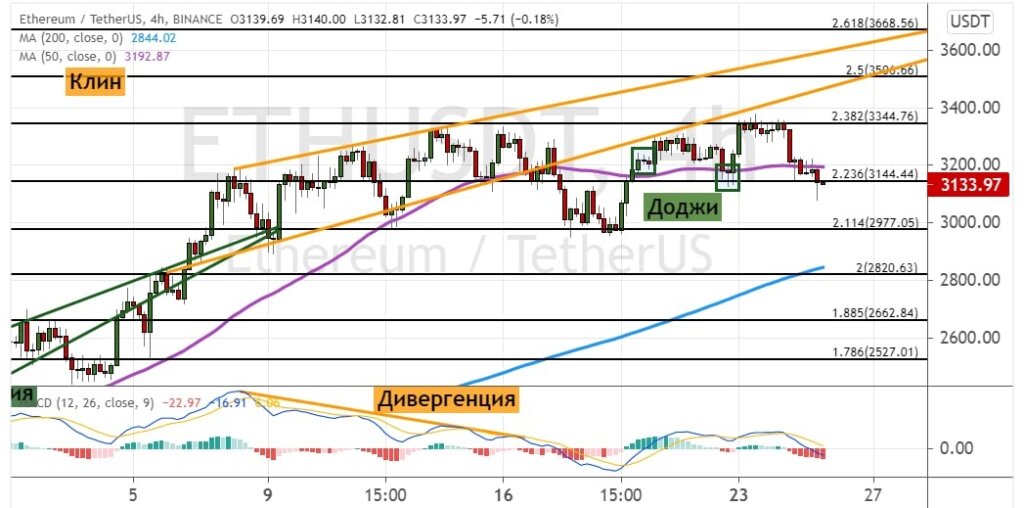 Эфир продолжает движение внутри консолидации уровней $3 150–$3 350. Это произошло после отскока от границ модели теханализа «Клин» (показана оранжевыми линиями на графике ниже).