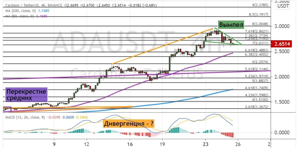ADA пока не удалось пробить важное сопротивление на уровне $3, что привело к коррекции до $2.6 и формированию модели теханализа «Вымпел» (показана зелеными линиями на графике ниже). Стоит отметить, что ранее мы отмечали риск снижения из-за сигнала в виде продолжительного роста цены ADA на осцилляторе MACD.