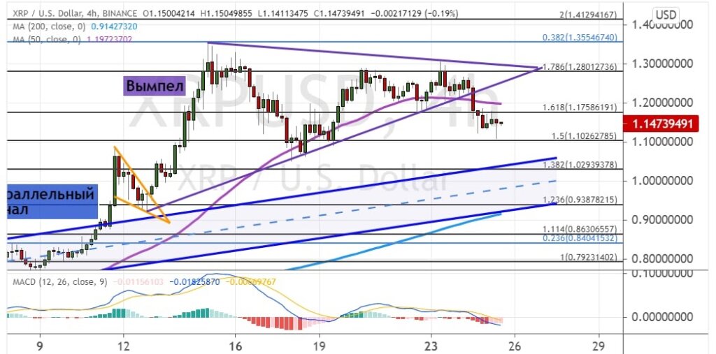 Криптовалюта XRP также уша в коррекцию, что привело к выходу за рамки модели теханализа «Вымпел» (показана фиолетовыми линиями на графике ниже), и опустилась ниже линии 50-периодной SMA. Сейчас котировки XRP развивают движение в рамках консолидации $1.10–$1.17. Более глубокая коррекция направит альткоин к уровням поддержки $1 и $0.94, где расположились границы модели теханализа «Восходящий параллельный канал» и линия 200-периодной SMA.