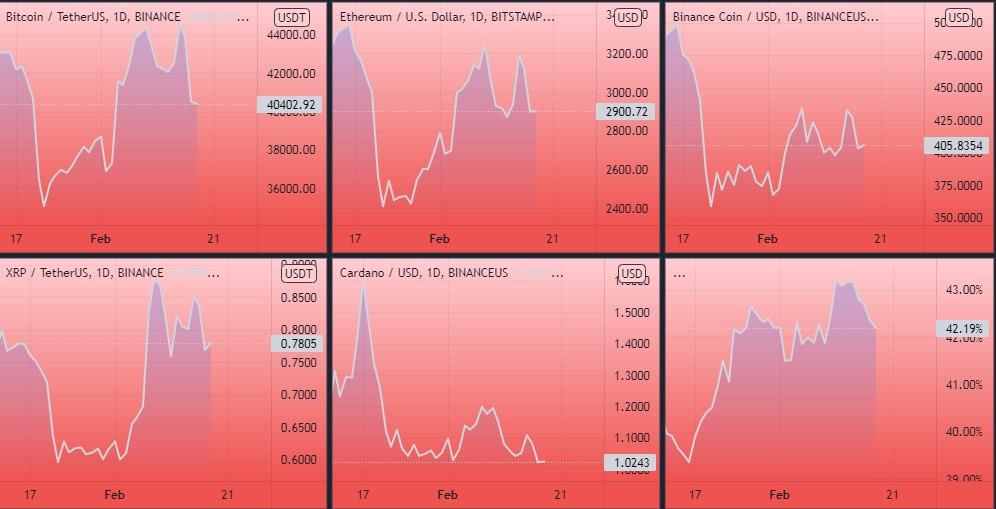 Динамика котировок BTC, ETH, ADA, BNB, XRP (дневной таймфрейм) и график доминации биткоина. Источник