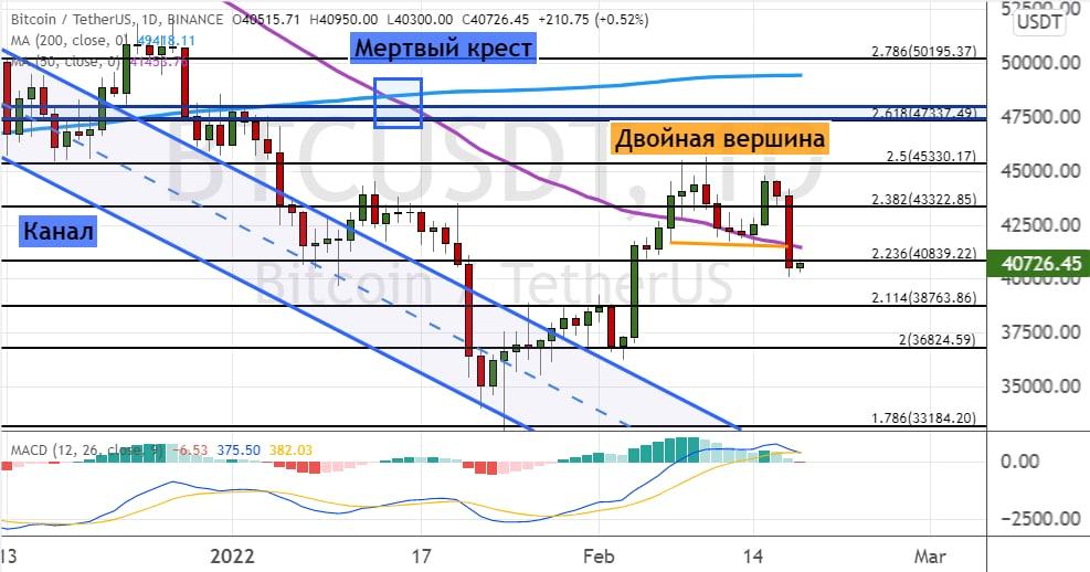 Развитие более глубокой коррекции откроет путь для снижения BTC к $38 700 и $36 800. В пользу этого варианта развития торгов указывают два сигнала: модель теханализа «Мертвый крест» (пересечение 50-дневной и 200-дневной SMA) и «Двойная вершина» (обозначена на графике ниже линиями оранжевого цвета). Сохранение медвежьей динамики может привести к движению котировок до $35 000 и $33 200, где проходит верхняя граница модели теханализа «Нисходящий канал» (обозначена на графике ниже линиями синего цвета).
