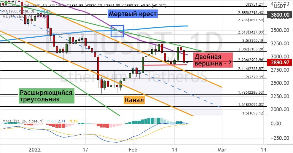 Котировки эфира также демонстрируют нисходящую динамику. После отскока от текущих сопротивлений $3 000 и $3 100, где расположились линия 50-дневной SMA и верхняя граница модели теханализа «Расширяющийся треугольник» (на графике ниже ее границы отмечены линиями зеленого цвета), ETH опустился ниже уровня $2 900.