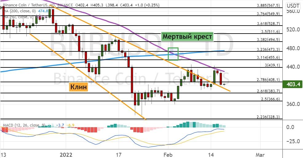 Текущие торги BNB проходят в районе ключевой поддержки $400, где также расположилась верхняя граница модели теханализа «Клин» (на графике ниже обозначена линиями оранжевого цвета).  Текущим сопротивлением выступает уровень $430.
