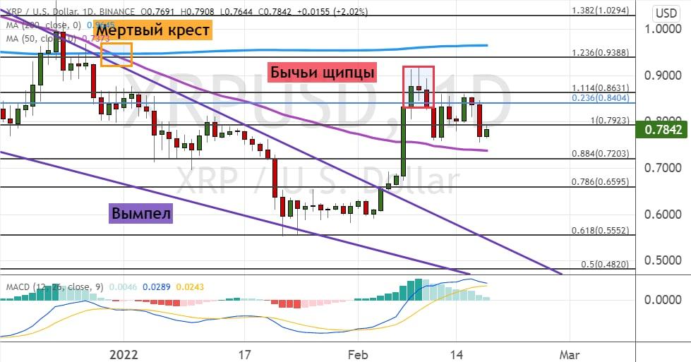 В случае продолжения снижения стоимость XRP может достичь поддержек $0.65, $0.6 и $0.55. В районе последней также проходит верхняя граница модели теханализа «Вымпел» (на графике ниже обозначена линиями фиолетового цвета). В пользу реализации этого сценария торгов указывает модель теханализа «Бычьи щипцы» (на графике ниже обозначена линиями бордового цвета).