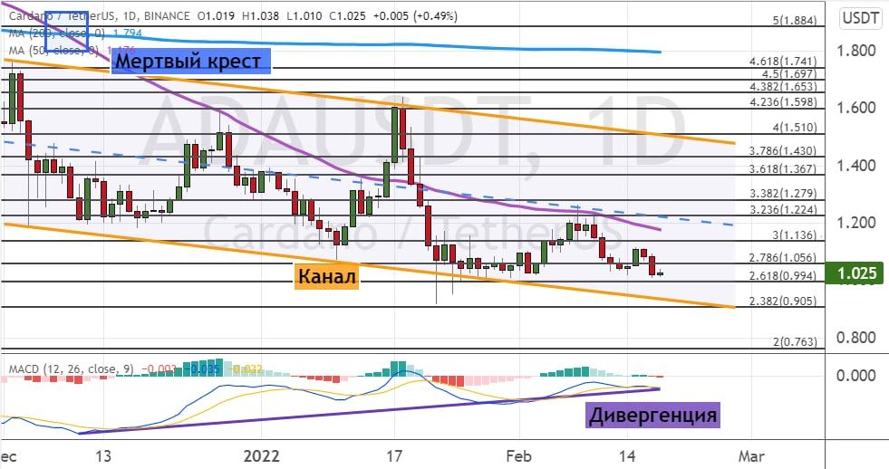 Более того, сохранение дивергенции между ценой на графике и MACD говорит о том, что котировки ADA, скорее, направятся к линиям сопротивления, которые расположены на уровнях $1.05 и $1.13. Чуть выше $1.13 проходит линия 50-дневной SMA и медиана модели теханализа «Нисходящий канал». Первой целью для быков выступают границы кластера $1.22–$1.28.