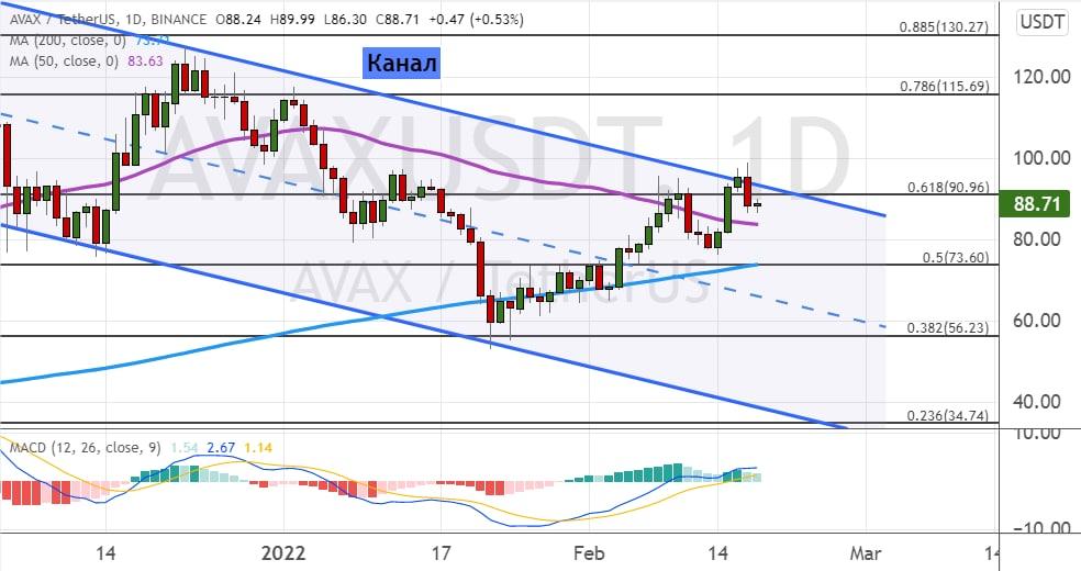 Котировки AVAX пытаются преодолеть уровень $91, где также проходит верхняя граница «Нисходящего канала» (модель обозначена на графике ниже линиями синего цвета), однако пока безуспешно. Если же быкам удастся пробить уровень сопротивления, это позволит AVAX направиться к психологически важному уровню $100. Далее быки направятся к первой цели $116.