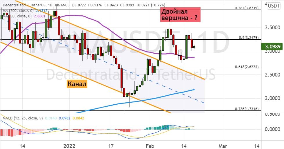 Лидерские позиции на рынке NFT продолжает удерживать MANA от виртуального мира Decentraland. Текущие торги проходят в районе $3.05. Однако сохранение позиций медведей приведет к снижению стоимости MANA до уровня $3.2. Текущими поддержками для котировок выступают $3 и $2.6, где проходит верхняя граница «Нисходящего канала» (модель обозначена на графике ниже линиями оранжевого цвета). Более глубокая коррекция направит котировки в район первой цели $2.2, где проходит линия 200-дневной SMA.