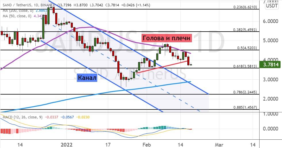 На рынке GameFi также лидирует токен SAND от The Sandbox, текущие торги которым проходят в районе поддержки $3.6. Закрытие цены ниже этого уровня приведет к снижению стоимости токена до $3, где также расположилась линия 200-дневной SMA. В пользу этого варианта указывает формирование модели теханализа «Голова и плечи» (обозначена на графике ниже линиями бордового цвета).