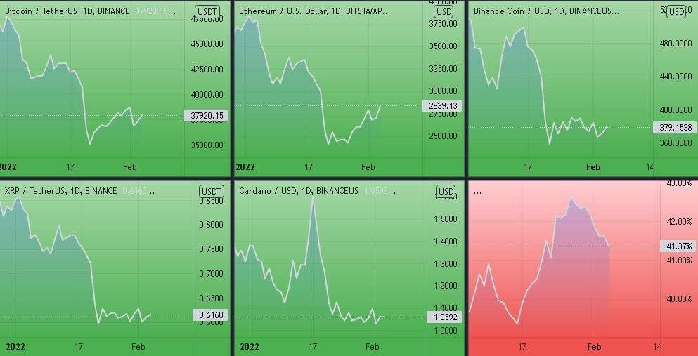 Динамика котировок BTC, ETH, ADA, BNB, XRP (дневной таймфрейм) и график доминации биткоина. Источник.