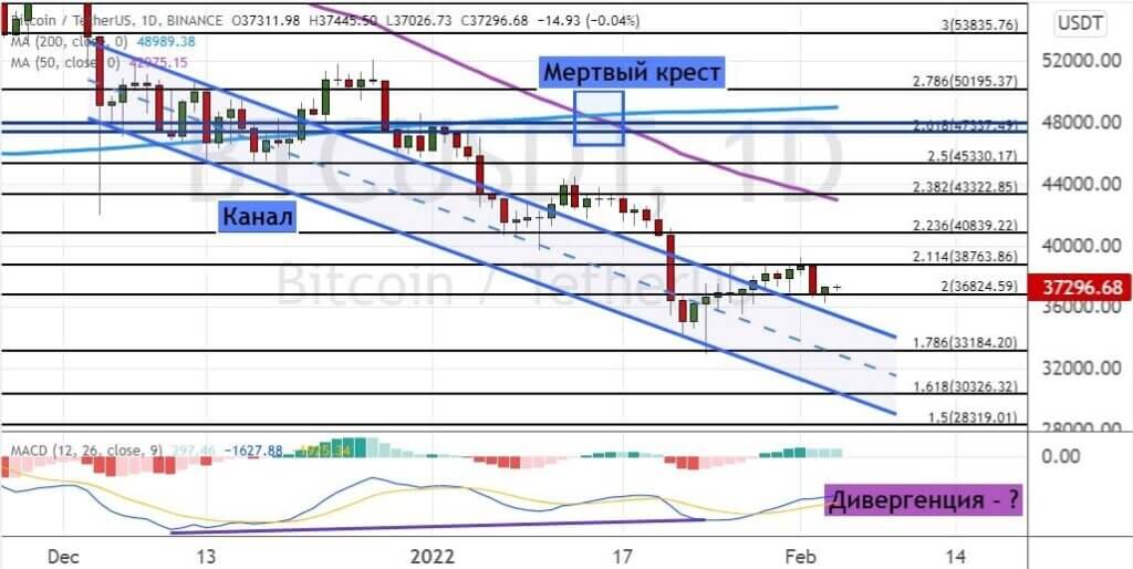 В случае обвала стоимости ниже $36 800 биткоин опустится к поддержкам на уровнях $35 000 и $33 200, где проходит верхняя граница модели теханализа «Нисходящий канал» (обозначена на графике ниже линиями синего цвета). Сохраняется риск развития более глубокой коррекции, которая направит первую криптовалюту к целям на $30 300 и $28 300.