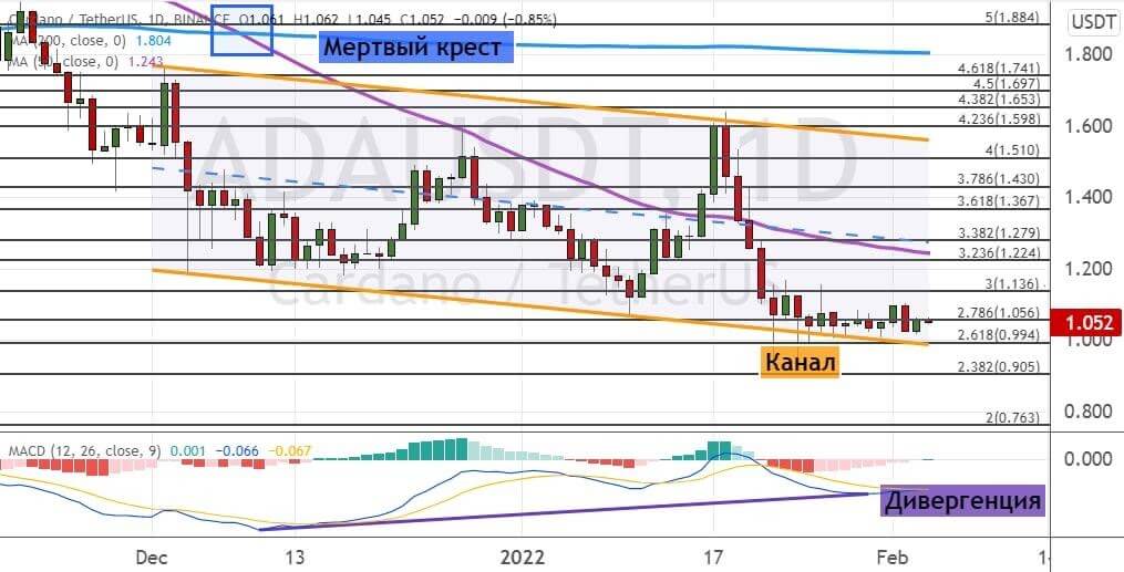 Котировки ADA преодолели сопротивление $1.05 и двигаются выше нижней границы модели теханализа «Нисходящий канал» (обозначена на графике ниже линиями оранжевого цвета).